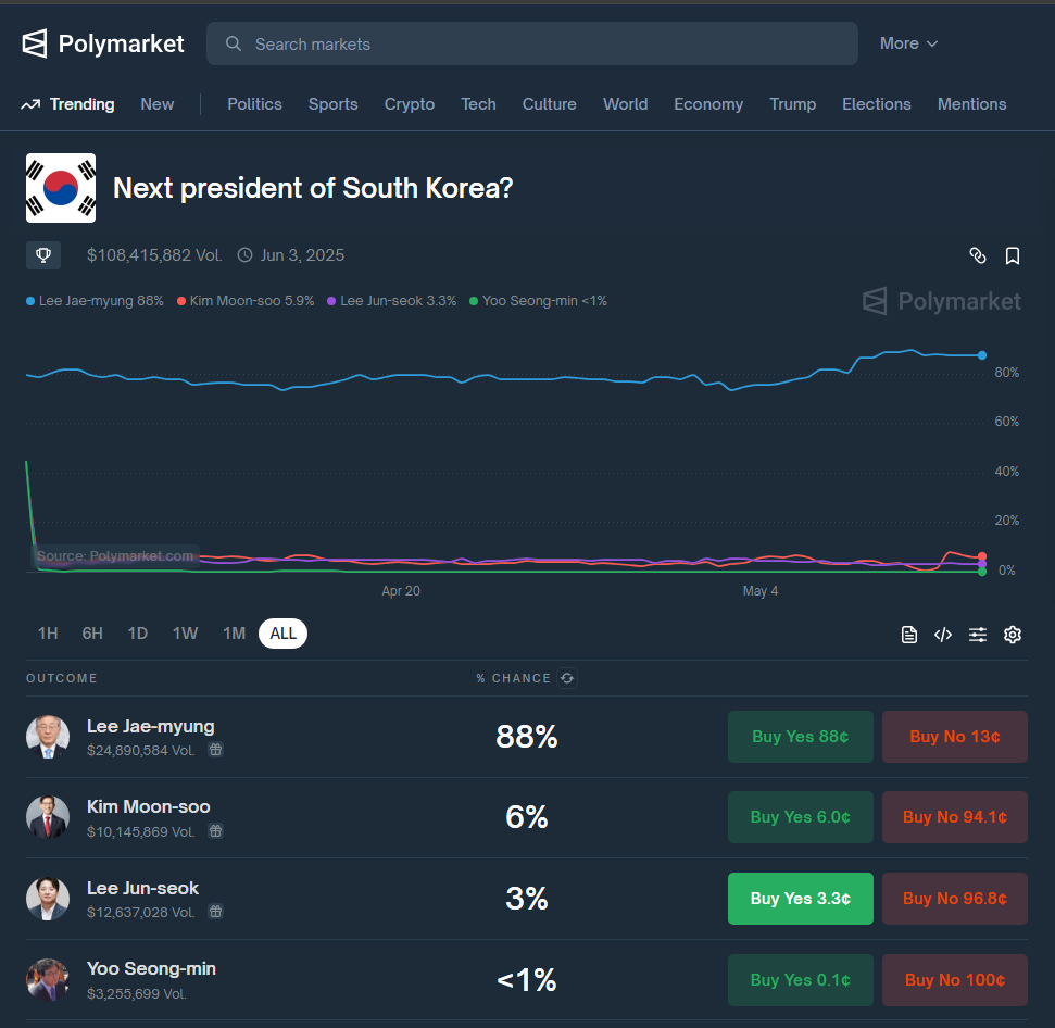 2025년 6월 3일 한국 대선 관련 시장에서 이재명 당선 확률이 90% 이상으로 평가되었다고 하죠.