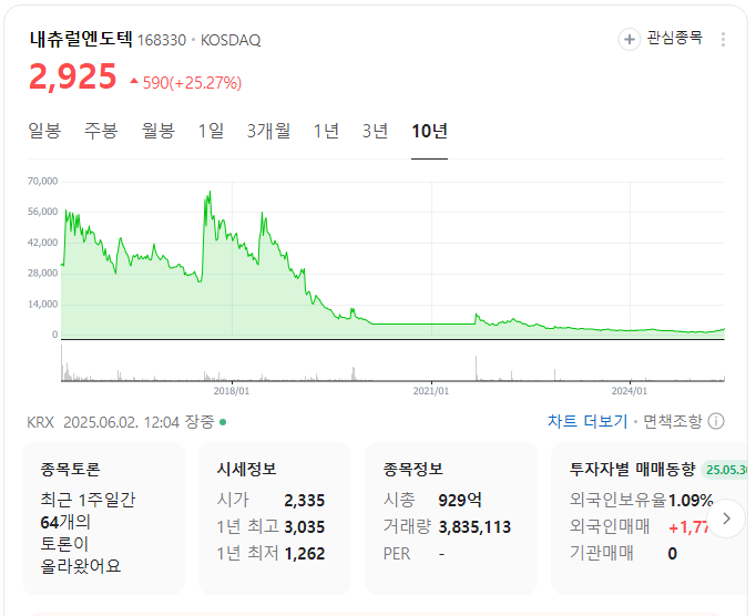 내츄럴엔도텍에 몰빵한 투자자들은 눈물을 흘렸죠. 😢